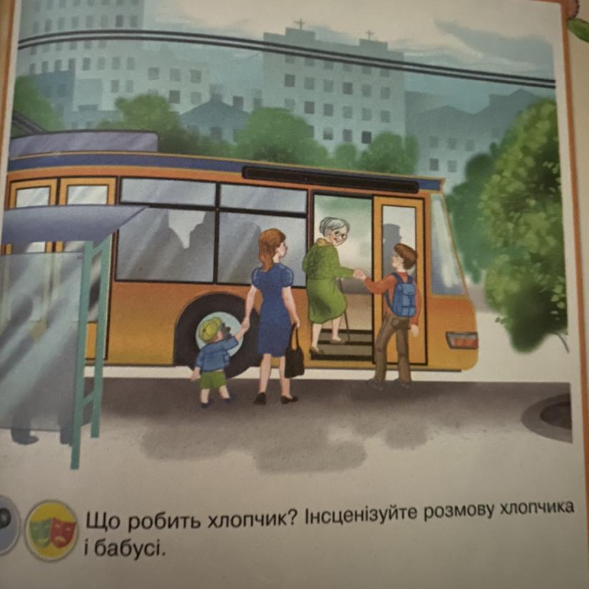 На малюнку зображено маленького хлопчика зі своєю мамою та юнака, який допомагає бабусі піднятися на зупинці в автобус.