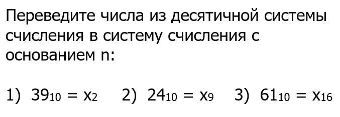 Для перевода числа из десятичной системы счисления в другую систему счисления нужно это число нацело разделить на основание системы счисления, полученное целое частное снова разделить на основание системы счисления и так далее до частного равного 0, результатом перевода будут остатки от деления, записанные начиная с последнего