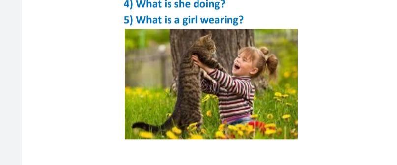 На картинке изображена девочка. Погода солнечная и теплая. Сезон - лето. Она берет кошку и смеется. Она выглядит очень счастливой!