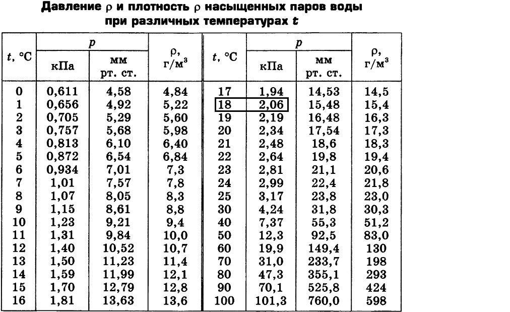 За таблицею "Тиск і гістина насиченої пари води при різних температурах" знаходимо тиск при 18 °С: р₁₈ = 2,06 кПа = 2060 Па