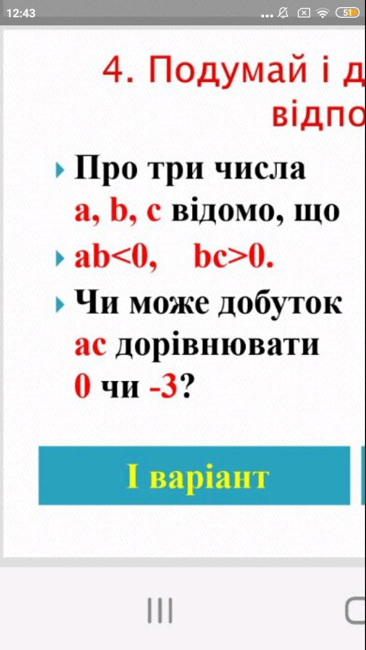 Приклад : 0,5 * (- 5 ) < 0 , - 5 * (- 6 ) > 0 i 0,5 * (- 6 ) = - 3 .