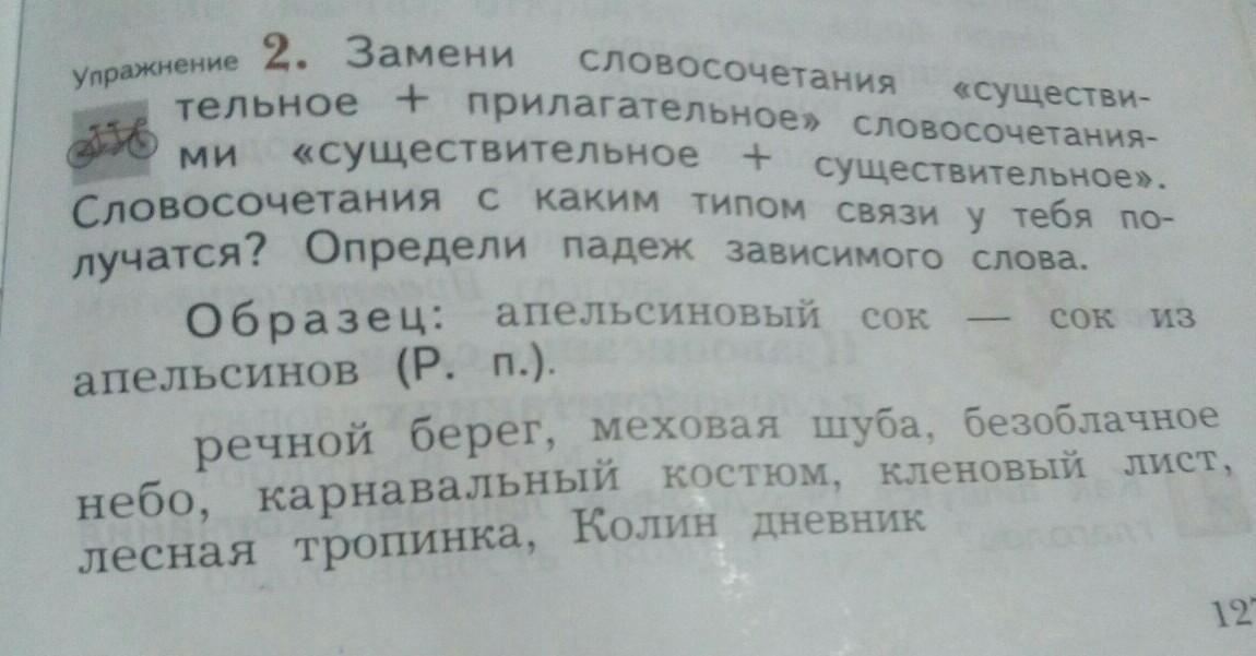 Речной берег — берег реки (р. п.), меховая шуба — шуба из меха (р. п.), безоблачное небо — небо без облаков (р. п.), карнавальные костюм — костюм для карнавала (р. п.), кленовый лист — лист клёна (р. п.), лесная тропинка — тропинка в лесу (п. п.), Колин дневник — дневник Коли (р. п.).