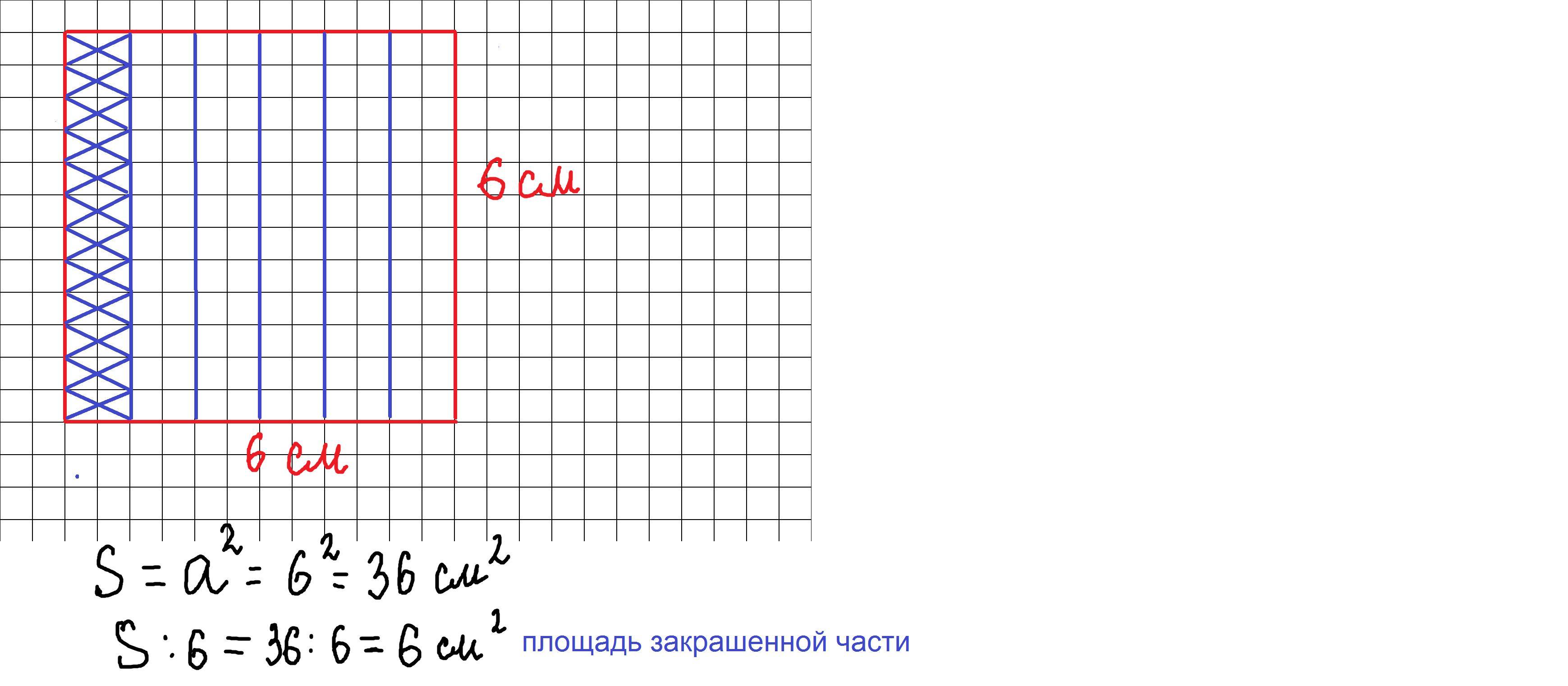 S=a² формула площади квадрата,т.к закрасили 1/6 часть,то поэтому ее площадь будет равна 36:6=6 см²
