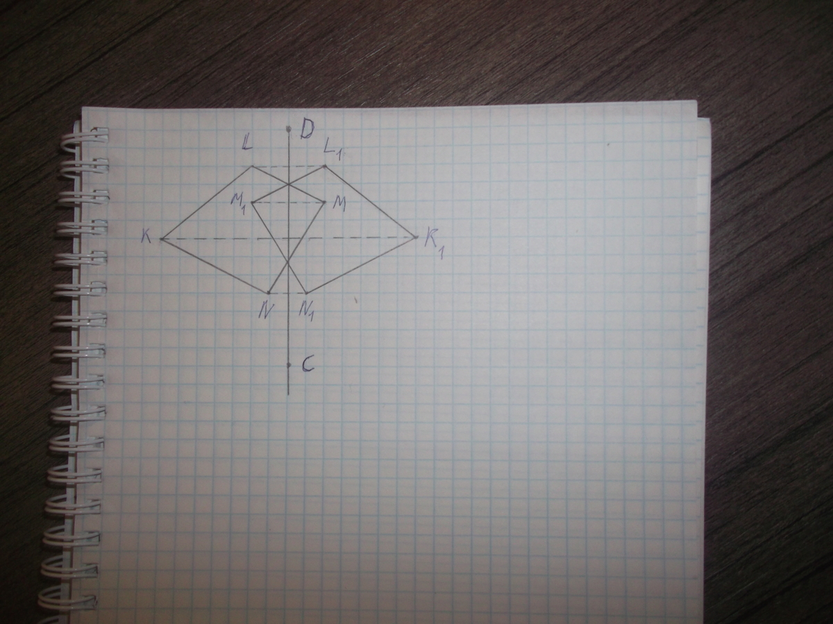 нарисуйте четырёхугольник и прямую CD, его пересекающую. Постройте четырёхугольник, симметричный нарисованному относительно прямой CD!