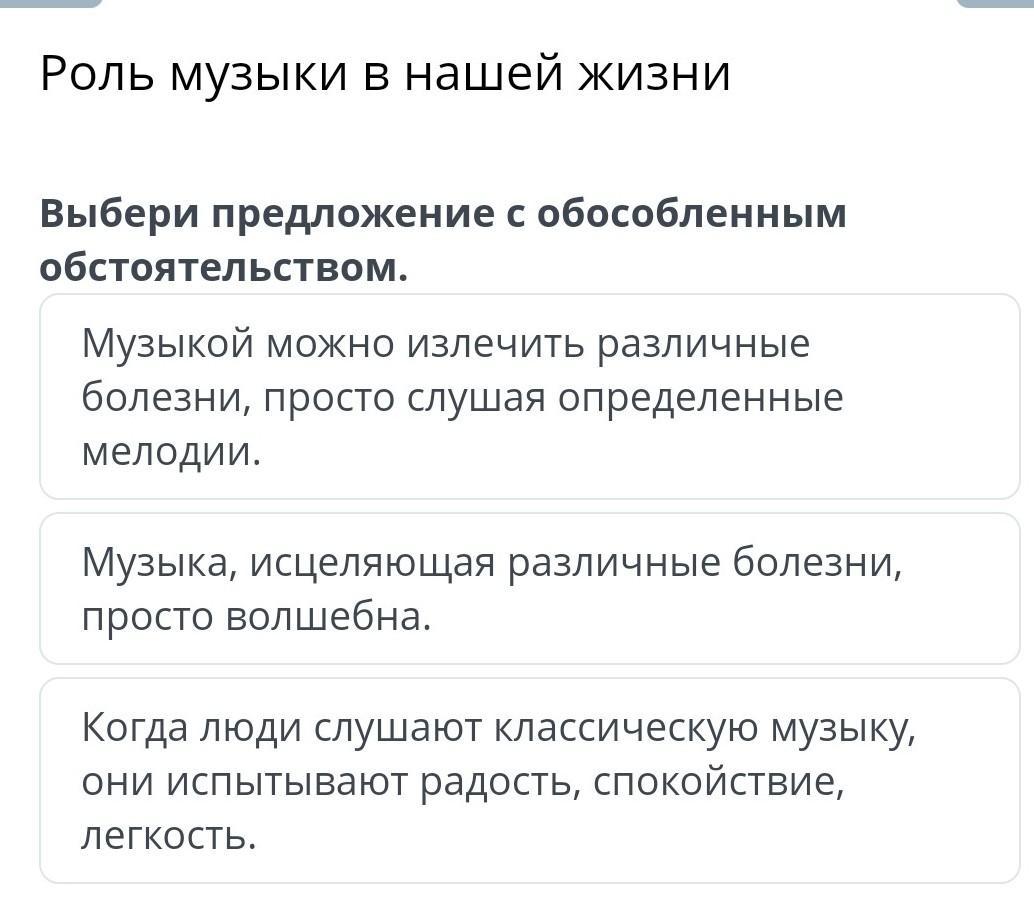 Выбери предложение с обособленным обстоятельством. Музыкой можно излечить различные болезни, просто слушая определенные мелодии. Музыка, исцеляющая различные болезни, просто волшебна. Когда люди слушают классическую музыку, они испытывают радость, спокойствие, легКОСТЬ.