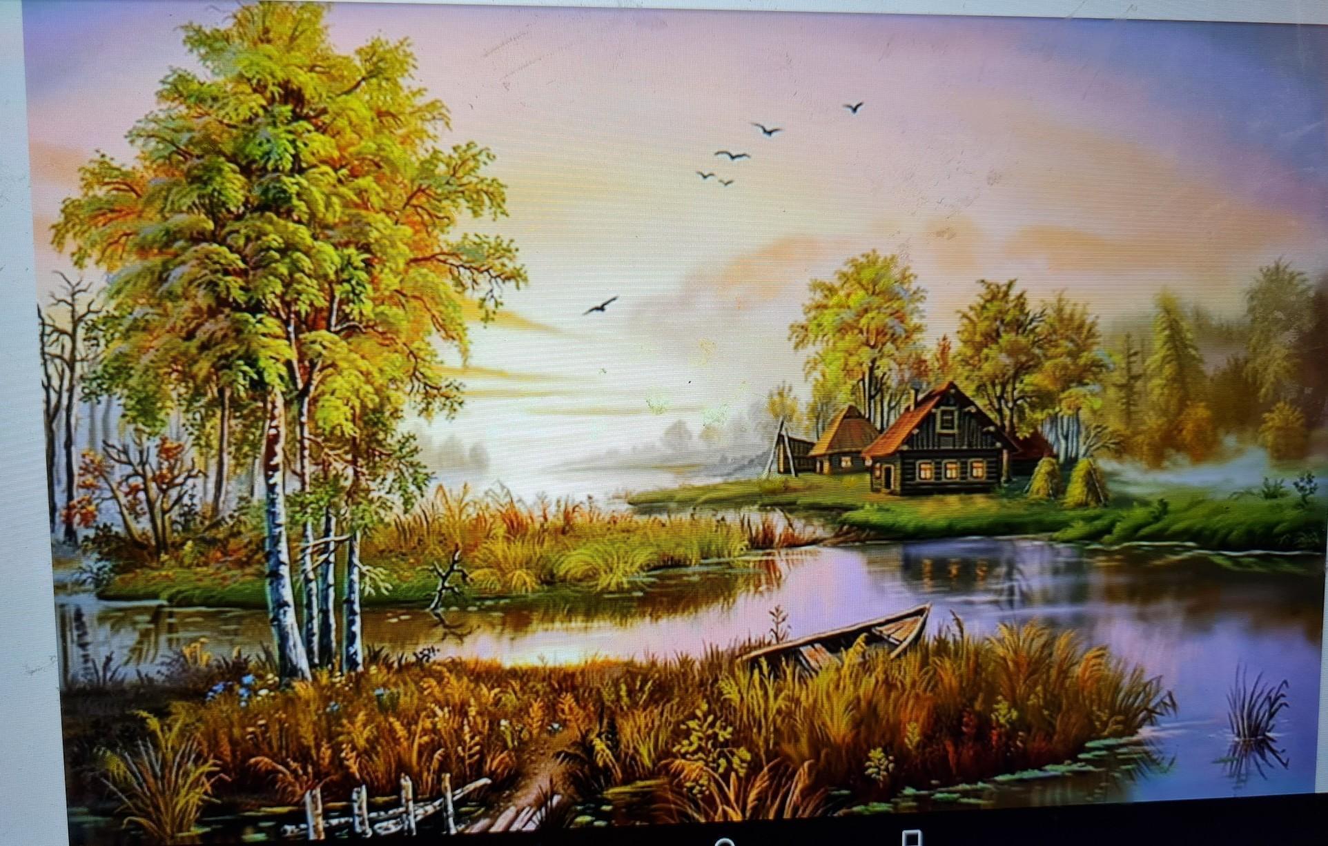 Картина содержит хутор с лодками и деревушками и рекой рядом находится лес птицы пролетают на деревянными домами яркое солнце входит над небом