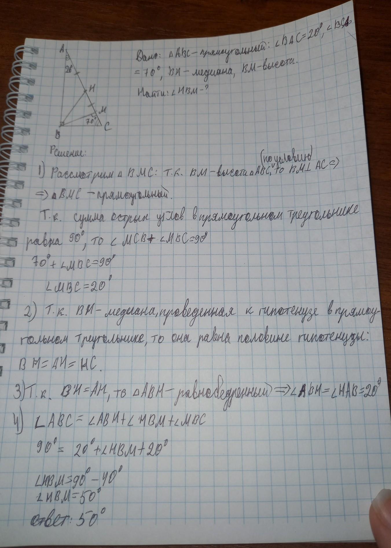 Острые углы прямоугольного треугольника равны 20º и 70º. Найдите угол между высотой и медианой проведенными из вершины прямого угла. Ответ дайте в градусах.