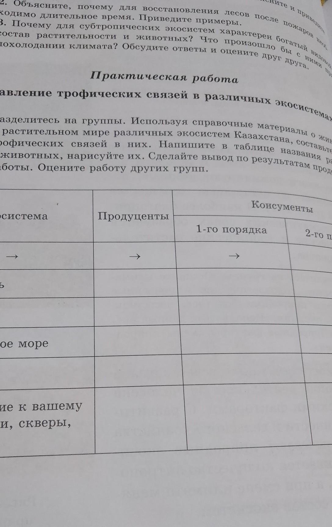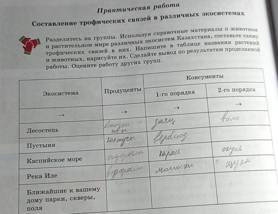Практическая работа Составление трофических связей в различных экосистемах Разделитесь на группы. Используя справочные материалы о живопису и растительном мире различных экосистем Казахстана, составьте секу трофических связей в них. Напишите в таблице названия растений и животных, нарисуйте их. Сделайте вывод по результатам проделанной работы. Оцените работу других групп. Консументы Экосистема Продуценты 1-го порядка 2-го порядка — Лесостепь Пустыня Каспийское море Река Иле Ближайшие к вашему дому парки, скверы, поля