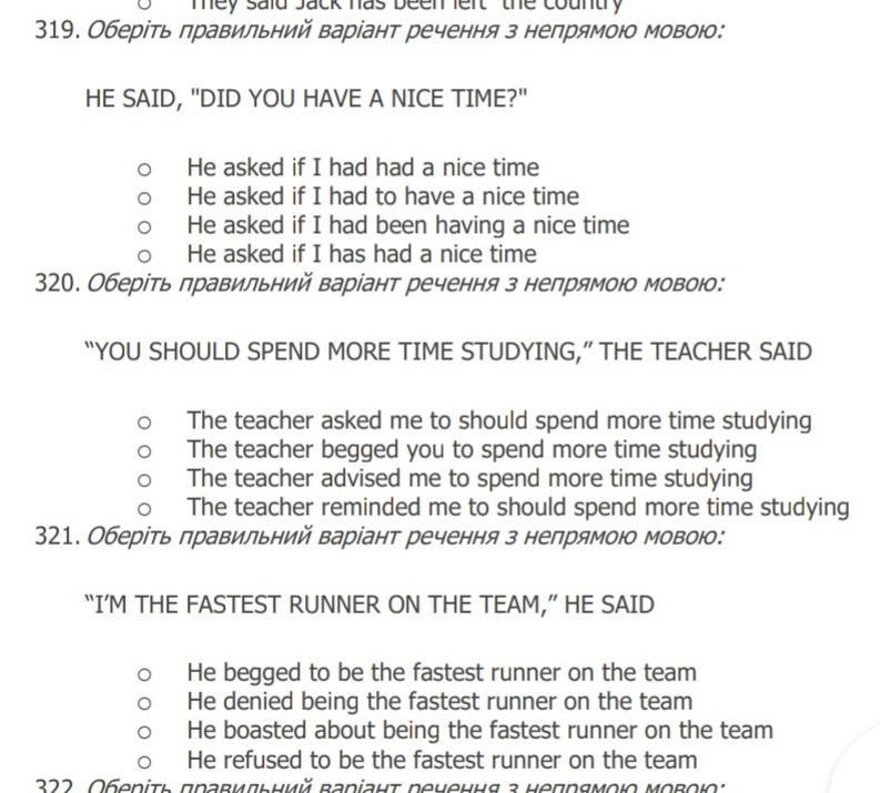320. В прямой речи используется модальный глагол should (следует / должен), который помогает выразить совет. Поэтому при передаче фразы в косвенной речи мы используем именно глагол advise (советовать). К тому же остальные предложения содержат ошибки.