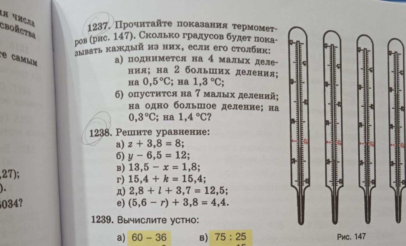 1237. Прочитайте показания термомет- ров (рис. 147). Сколько градусов будет пока- зывать каждый из них, если его столбик: а) поднимется на 4 малых деле- ния; на 2 больших деления; на 0,5°C; на 1,3 °С; б) опустится на 7 малых делений; на одно большое деление; на 0,3°C; на 1,4 °С?