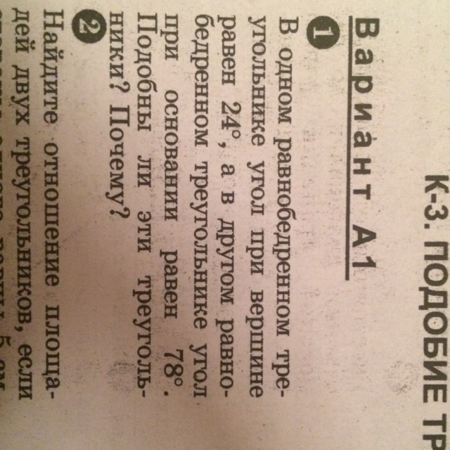 в одном равнобедренном треугольнике угол при вершине равен 24 градусов, а в другом равнобедренном треугольнике угол при основании равен 78 градусов. Подобны ли эти треугольники? Почему?