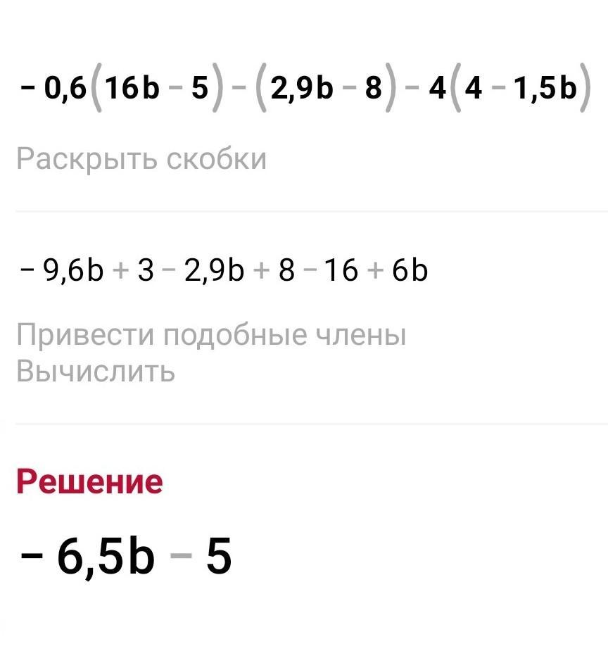 4. Спростіть вираз -0,6(16b – 5) - (2,9b – 8) — 4(4 - 1,5b) і обчисліть його значення при b= -9/13