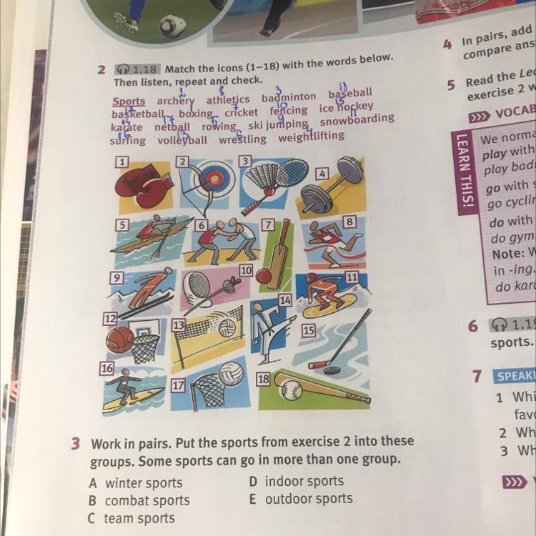 D indoor sports:weightlifting,backetball,boxing,ice hockey,fencing,badminton,athletics,wrestling,karate,volleyball,netball.