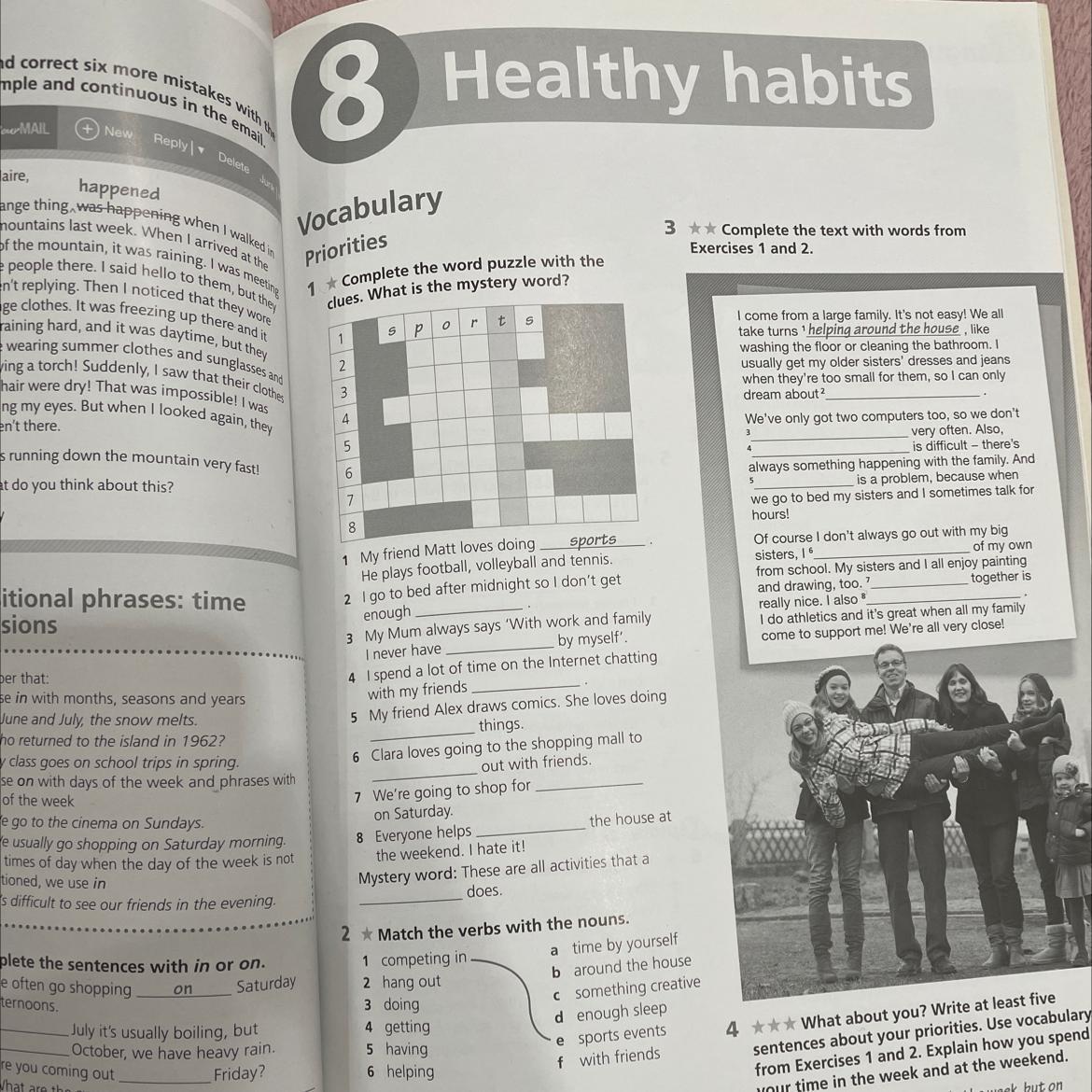 1 Complete the word puzzle with the clues. What is the mystery word? 1 S por t s 2 3 4. 5 6 7 8 1 My friend Matt loves doing Sports He plays football, volleyball and tennis 2 I go to bed after midnight so I don't get enough 3 My Mum always says 'With work and family I never have 4 I spend a lot of time on the Internet chatting with my friends 5 My friend Alex draws comics. She loves doing things 6 Clara loves going to the shopping mall to by myself out with friends 7 We're going to shop for on Saturday 8 Everyone helps the weekend. I hate it! the house at Mystery word: These are all activities that a does. Срочно нужно ПОМОГИТЕ