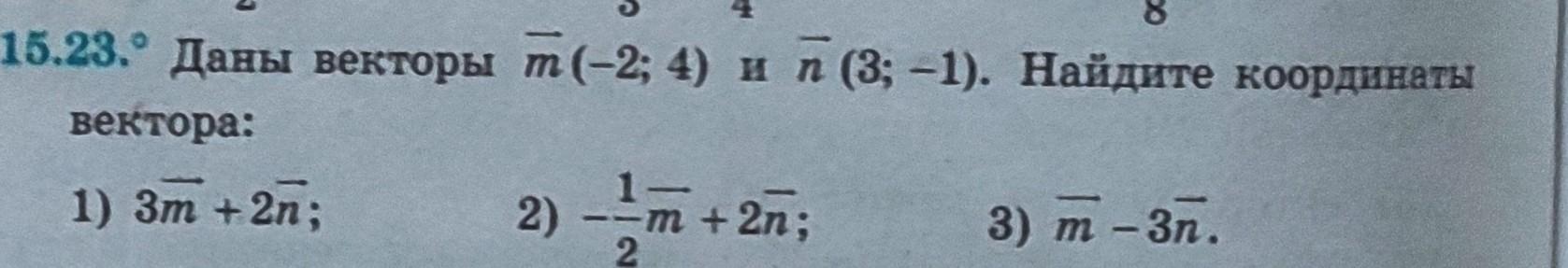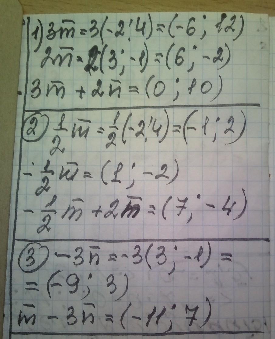 1) 3m + 2n = 3(-2;4) + 2(3;-1) = (-6;12) + (6;-2) = (0;10)