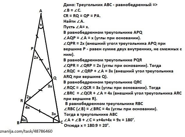 ∠RQC = ∠QRP + ∠A = 3х (внешний угол треугольника ARQ при вершине Q - равен сумме двух внутренних, не смежных с ним).