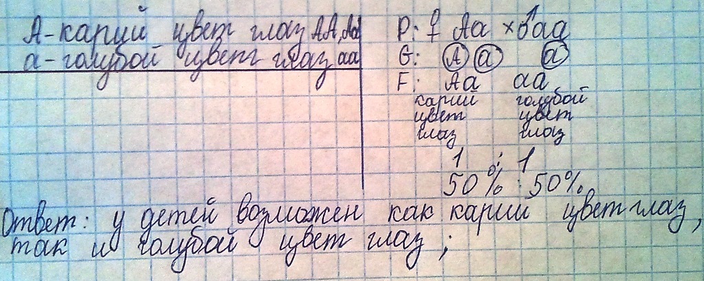 у человека карего цвета глаз доминирует над голубым. Гетерозиготная кареглазая женщина вышла за голубоглазого мужчину. Какой цвет глаз возможен у их детей?