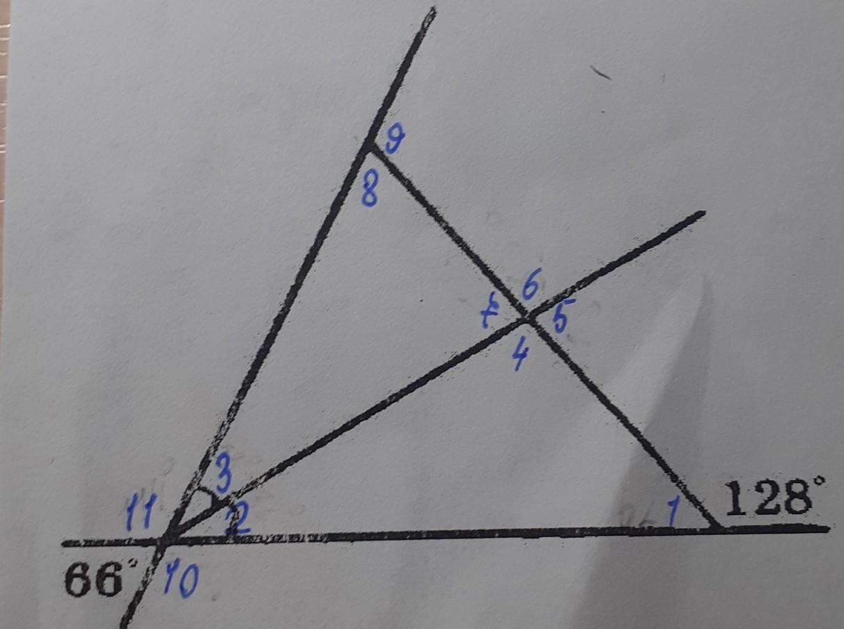 вертикальные углы<11=<10=180-66=114(по теореме смежных углов)