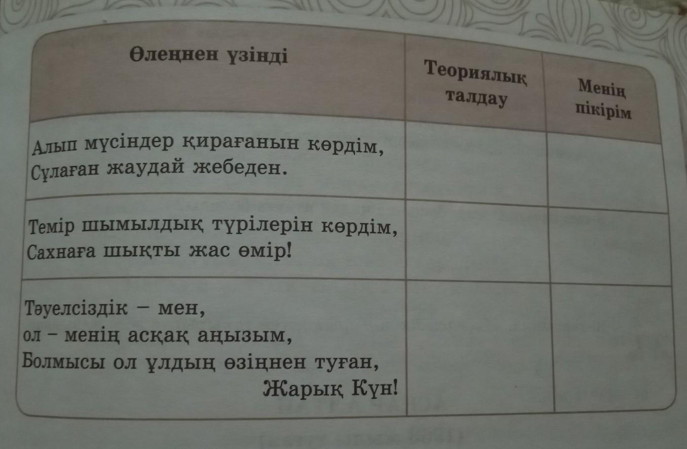 Өлеңнен үзінді Теориялык талдау Memin пікірім Алып мүсіндер кирағанын көрдім, Сұлаған жаудай жебеден. Темір шымылдык түрілерін көрдім, Сахнаға шықты жас өмір! Тауелсіздік - мен, ол – менің асқақ аңызым, Болмысы ол ұлдың өзіңнен туған, жарық күн!