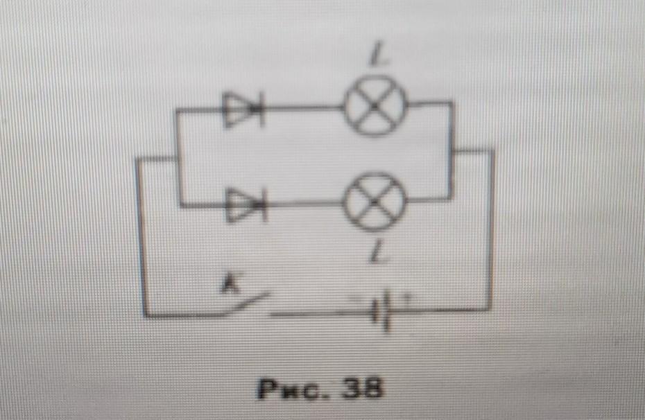 5. На рис. 38 показана электрическая цепь, в которую включены полупроводниковые диоды. Будут ли гореть лампочки при замыкании ключа? Обосновать! Pис. 38