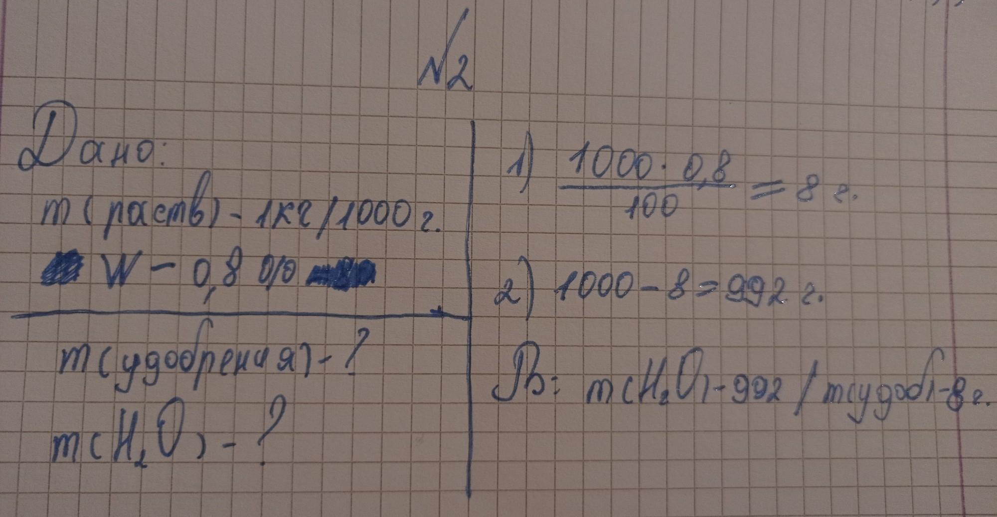 Задача 2. Какие массы удобрения и воды необходимо взять для приготовления 1 кг раствора с массовой долей удобрения 0,8%?