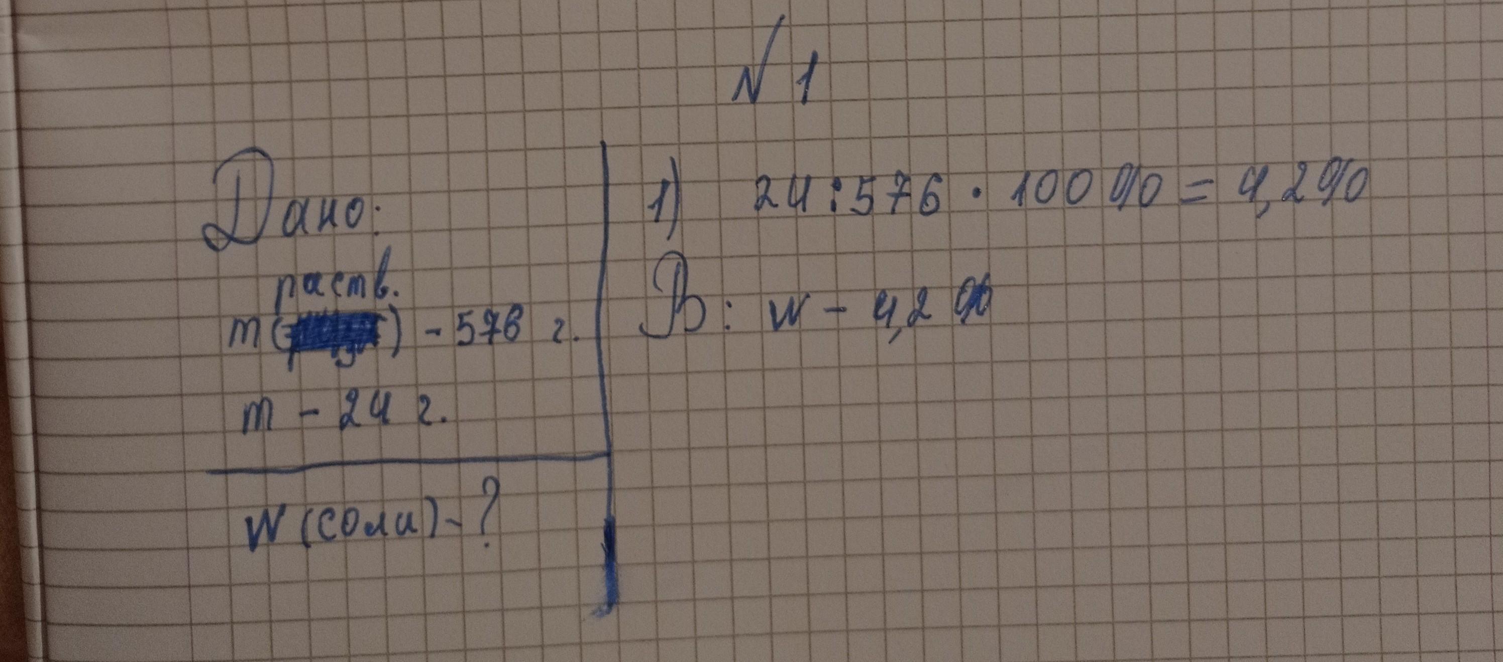 Задача 1. В 576 г воды растворили 24 г соли. Вычислите массовую долю соли в растворе.