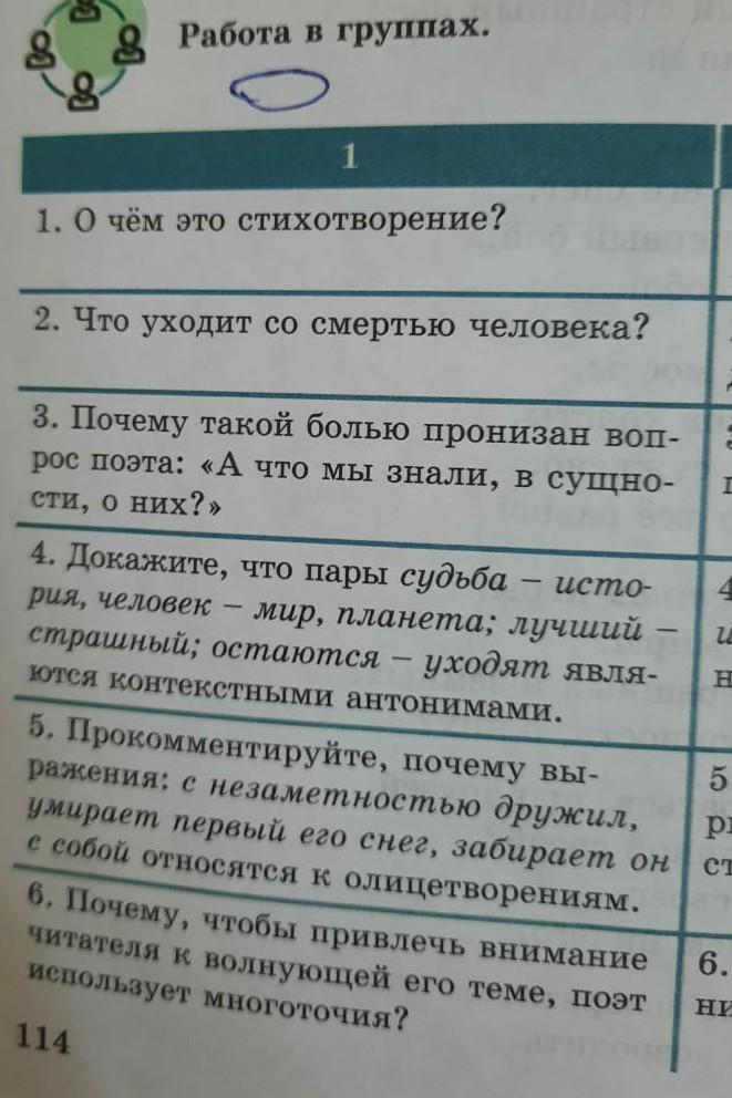 О чём это стихотворение? 2. Что уходит со смертью человека? 3. Почему такой болью пронизан воп- рос поэта: «А что мы знали, в сущно- сти, о них?» 4. Докажите, что пары судьба-исто- рия, человек-мир, планета; лучиий страшный; остаются - уходят явля- ются контекстными антонимами. 5. Прокомментируйте, почему вы- ражения: с незаметностью дружил, умирает первый его снег, забирает он с собой относятся к олицетворениям. 6. Почему, чтобы привлечь внимание читателя к волнующей его теме, поэт использует многоточия?7. Какой тип речи использует Евтy- тенко: описание, повествование или рассуждение? Почему? 8. К какому виду лирики относится стихотворение: пейзажной, граждан- ской, философской или любовной? 9. Лирический герой стихотворения: жизни, потому что че- разочарован ловек смертен; размышляет о много- гранности человека как личности; считает, что жизны человека бессмыс- ленна? 10. Как называется художественно- изобразительное средство, использо- ванное в словосочетаниях умирает снег, умирают миры: метафора, эпи- тет, сравнение или метонимия? 11. Какое значение имеет сравнение человека с миром («Не люди умира- ют, а миры»)? Срочно нужно