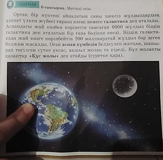 5 класс 6-тапсырма,вот предложение---->Күн-Жерден орташа алғанда 150 млн км кашыктықта орналасқан ғаламшар. Ол-бiздiң галактиканын кішігірім жұлдызы . Жарық Жер бетіне секундына 300 000 км жылдамдықпен 8 минутта жетедi . Жарык бiр жылда 9 460 528 405 000 км жол журедi . Осы кашыктық "астрономияда" бір жарык жылы деп аталады . Ғалымдар галактикалардын жасы 12-15 миллиардқа жуық жыл аралығын құрайды деп санайды . Орталыққа жақын орна ласкан жұлдыздар кәрi , ал шеткері орналасқан жулдыздар жас жулдыздар болып саналады . Көптеген жұлдыздарды олардың галамшарлары теңіректеп айналып жүреді . Күнді айналатын "ғаламшарлар" мен денелер толығырақ зерттелген . Олардың қатарына сегiз галамшар енедi : Меркурий ( Кіші Шолпан ) , Шолпан , Жер , Марс ( Кызыл жұлдыз ) , Юпитер ( Есеккырган ) , Сатурн , Уран , Нептун . 7-тапсырма они связанные упражнения помагите 7 - тапсырма . Мәтінге ат кой . Сан есімдерді тауып , мағыналық түрлеріне қарай ажырат .