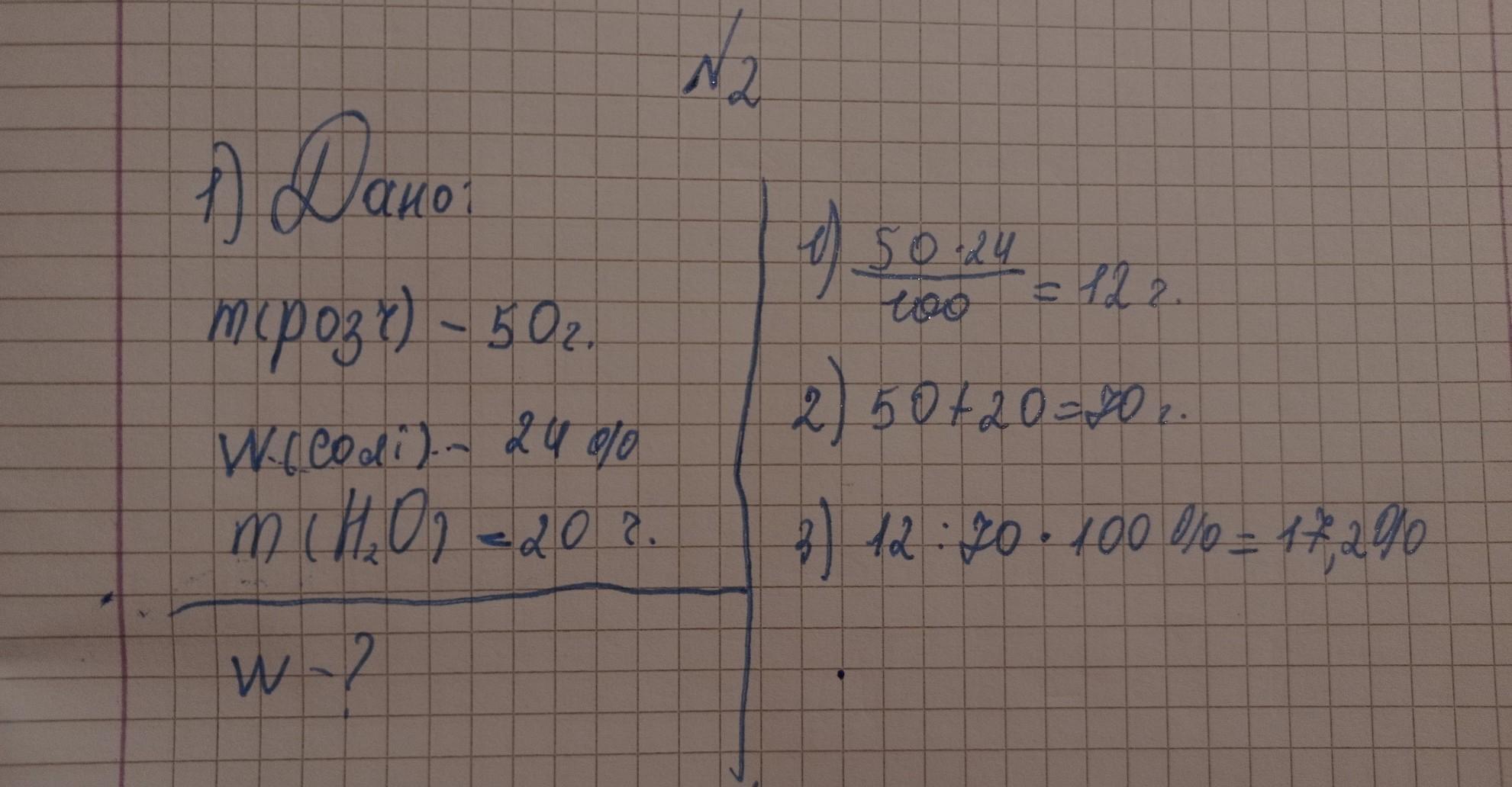 2)Визначте як змінітся масова частка, якщо до 50 г розчину добутого у досліді 1 додати 20 мл води.
