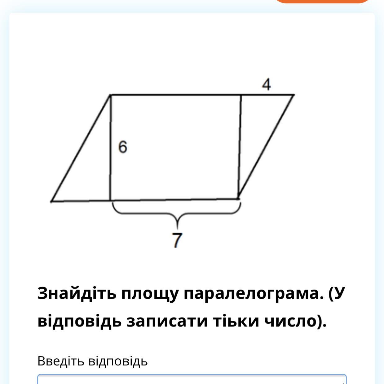 Формула площади параллелограмма равна S=a*h, где а это сторона к которой проведена высота, а h та самая высота. Чтобы найти а надо сложить 7+4, потому что квадрат, у которого всё страны равны и два треугольника,который равны друг другу и в том числе их стороны,то есть получается а= 11. Высота h известна,она равна 6. Таким образом, поставляем в формулу числа и получается S= 11*6= 66. Площадь параллелограмма равна 66