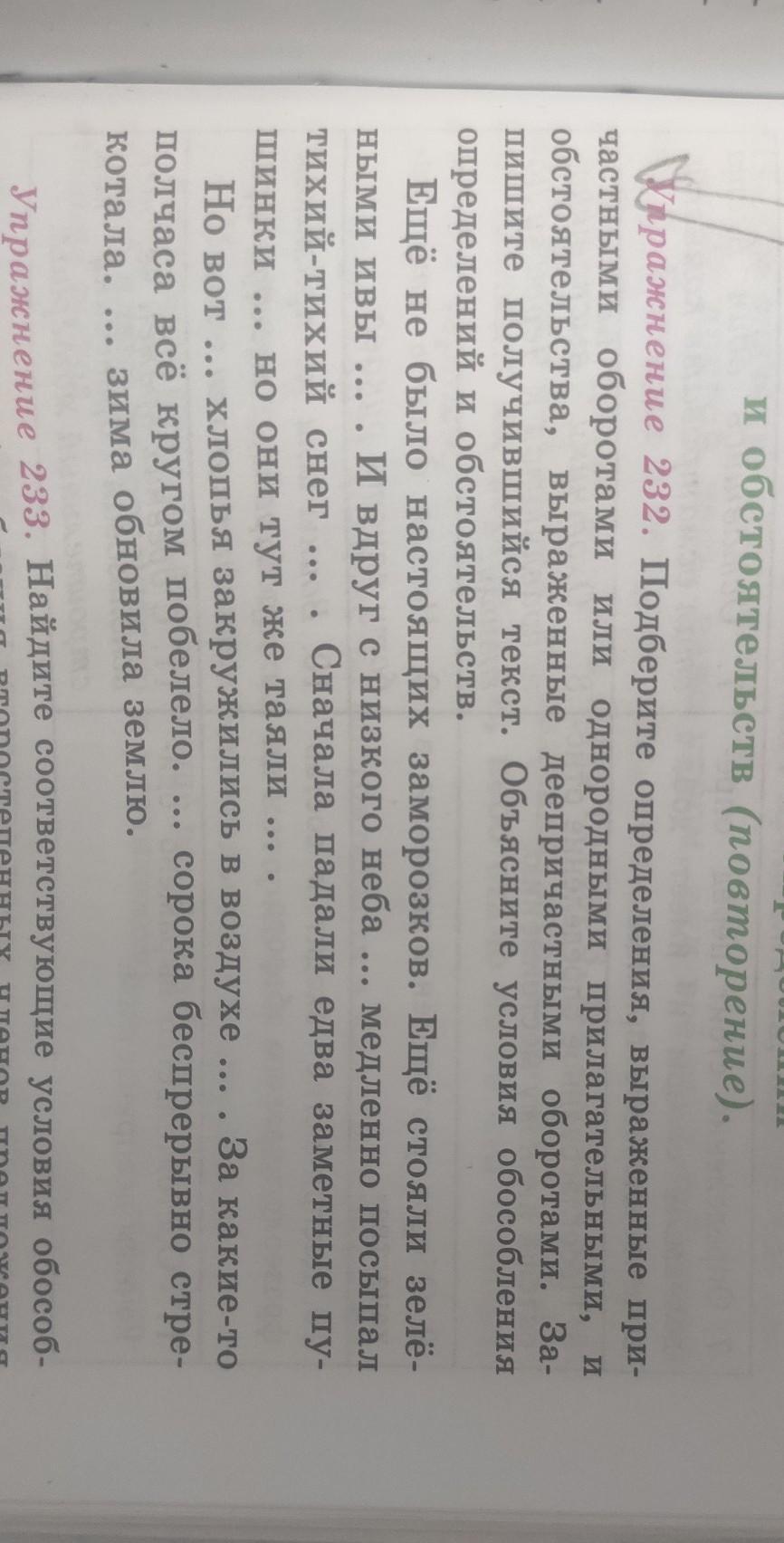 Упражнение 232. Подберите определения, выраженные причастными оборотами или однородными прилагательными. Запишите получившийся текст........