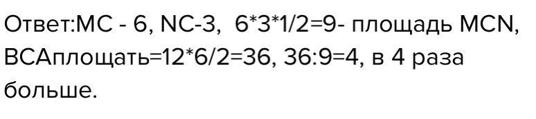 Во сколько раз площадь прямоугольного треугольника BCA больше стороны MC и NC в 2 раза меньше сторон ВС и АС?