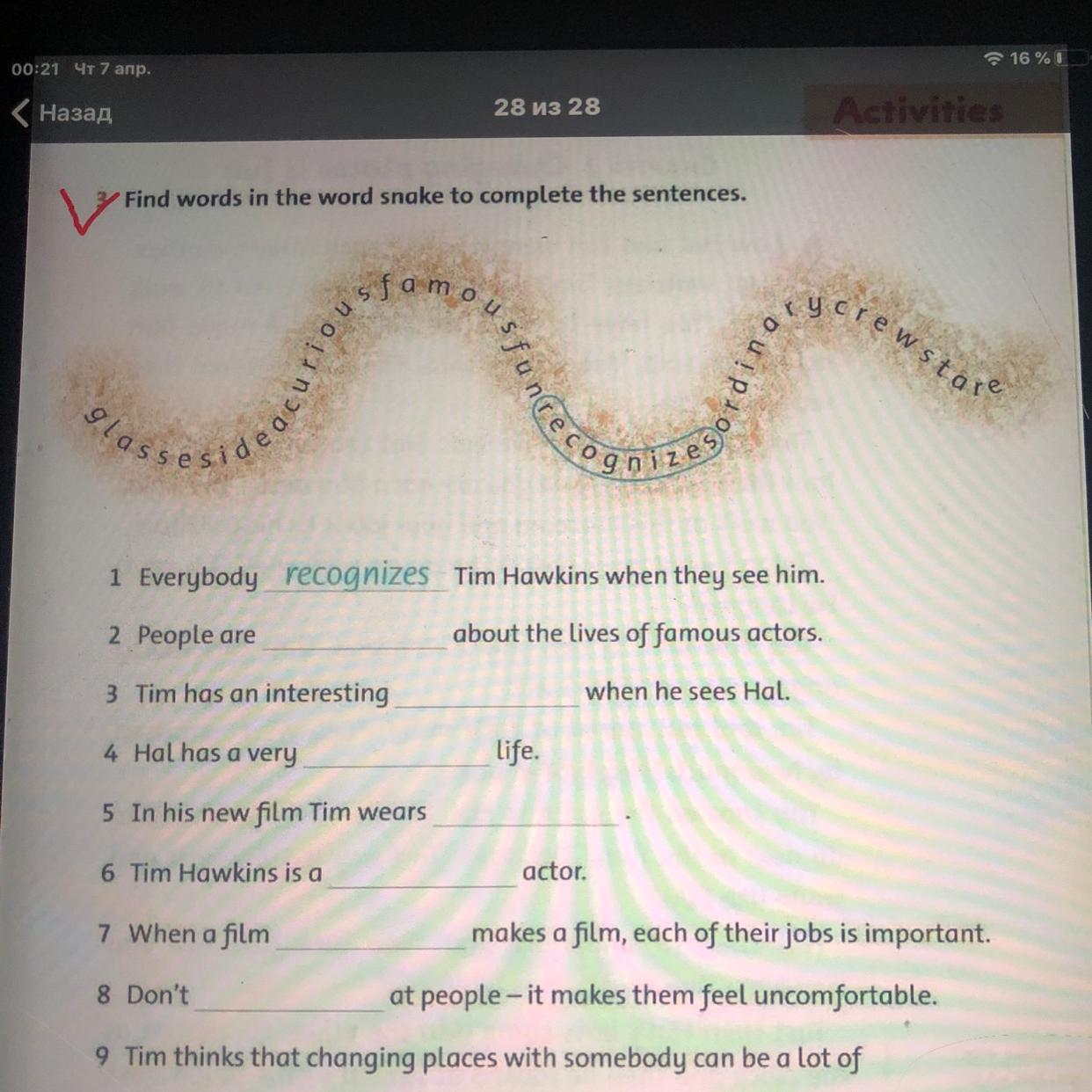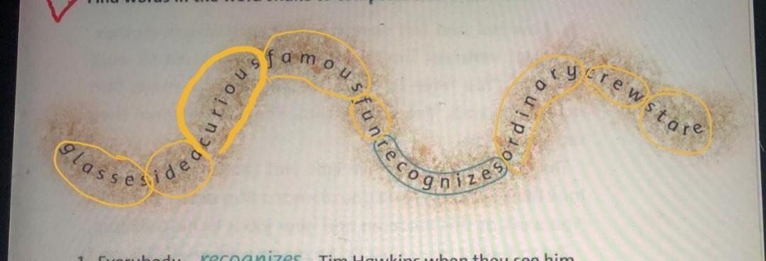 Find words in the word snake to complete the sentences.