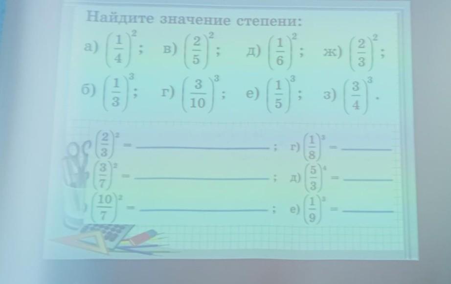 # a ) ( 2/3 )² = 4/9 ; г ) ( 1/8 )³ = 1³/8³ = 1/512 ;