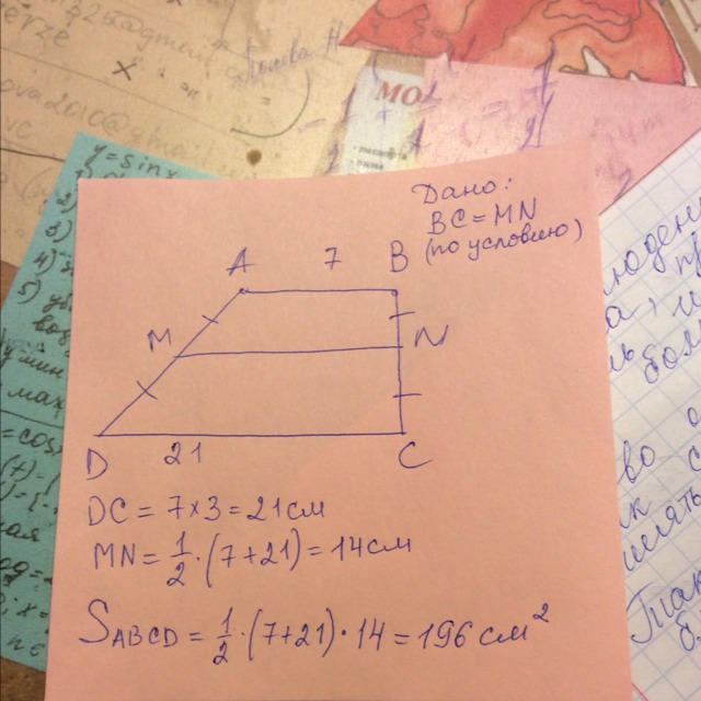 основание трапеции равно 7, другое-в 3 раза больше. Высота трапеции равно ее средней линии. Найдите площадь трапеции.