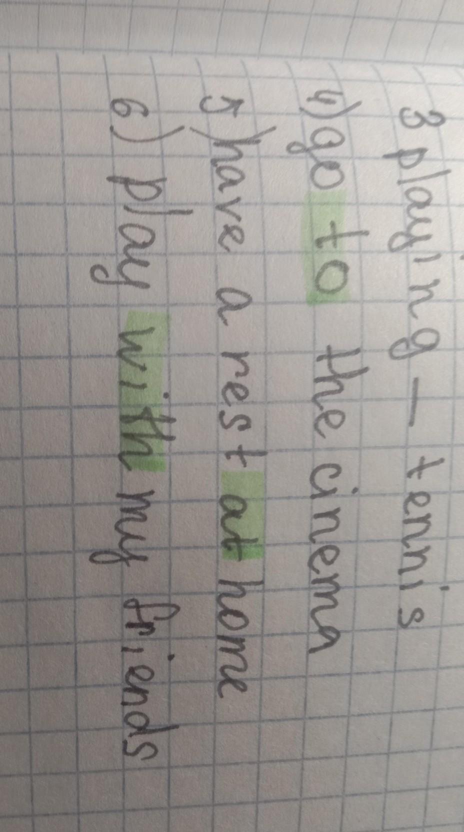 Употребить глаголы. дам 20баллов срочно . Ex. 1 Write the missing prepositions. 1. sitting the yard 2. go a walk 3. playing __ tennis 4. go__ the cinema 5. have a rest_home 6. play—my friends