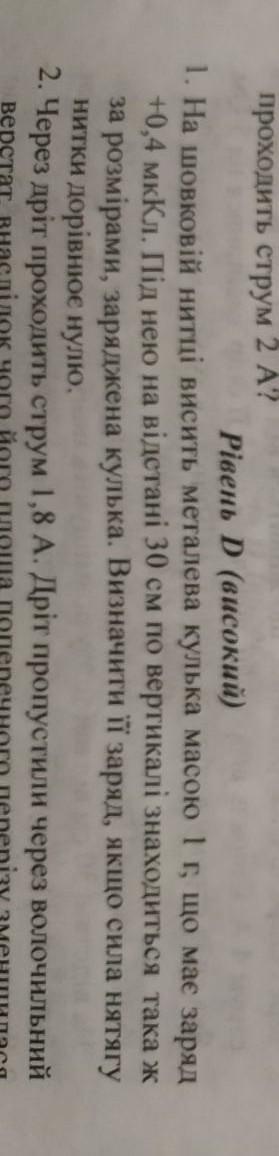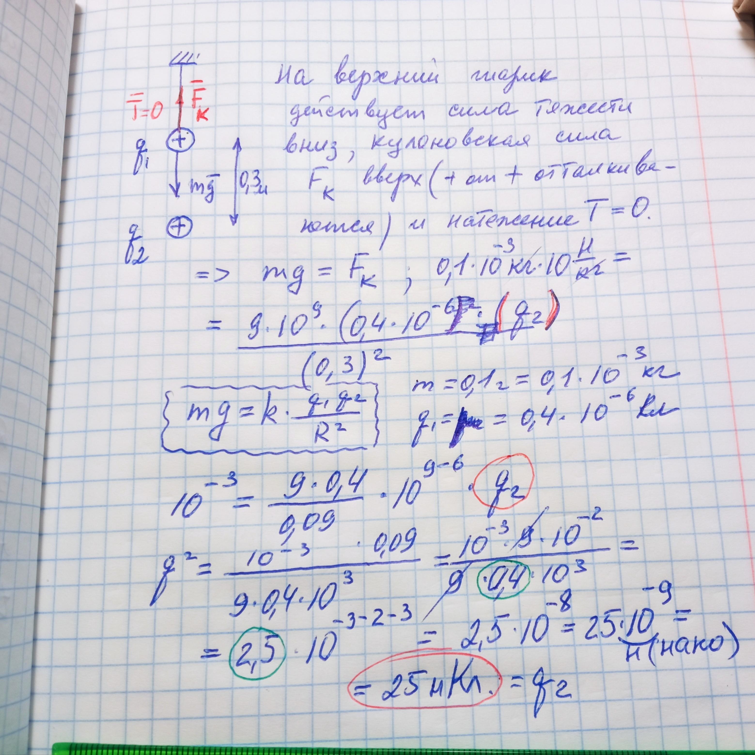 На шовковій нитці висить металева кулька масою 1 г, що має заряд +0,4 мкКл. Під нею на відстані 30 см по вертикалі знаходиться така ж за розмірами, заряджена кулька. Визначити її заряд, якщо сила натягу нитки дорівнює нулю.