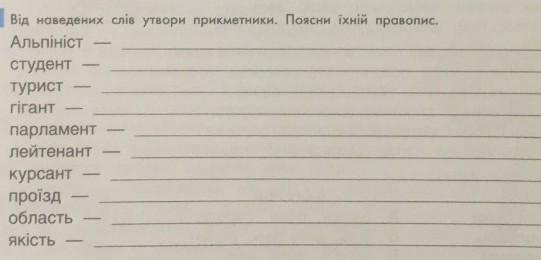 Ответ:альпінійський, студентський, туристський, гігантський, парламентський, лейтенантський, курсантський, проїздний, областний(областневий), якісний