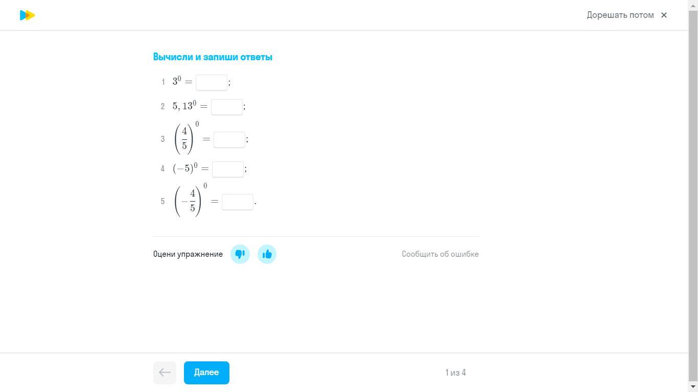 Любое число (за исключением 0) в нулевой степени равняется 1.