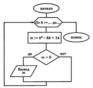 По блок-схеме алгоритма определите границы изменения возрастающей переменной k в заголовке цикла «От k := … до …», если было выведено три числа: 7; 2; 2.