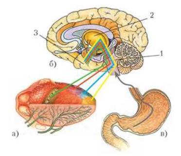 б) інформація, сприйнята смаковими рецепторами, по нервових шляхах передається довгастому мозку (1), гіпоталамусу (2) і надходить у скроневу частку кори великих півкуль головного мозку (3);