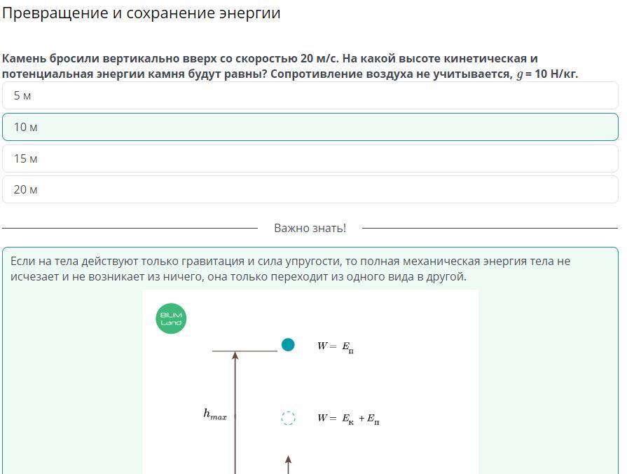 камень был брошен вертикально вверх со скоростью 20 м / с. На какой высоте кинетическая энергия и потенциальная энергия камня будут равны?(Сопротивление воздуха не учитывается, g = 10 н/ kr)