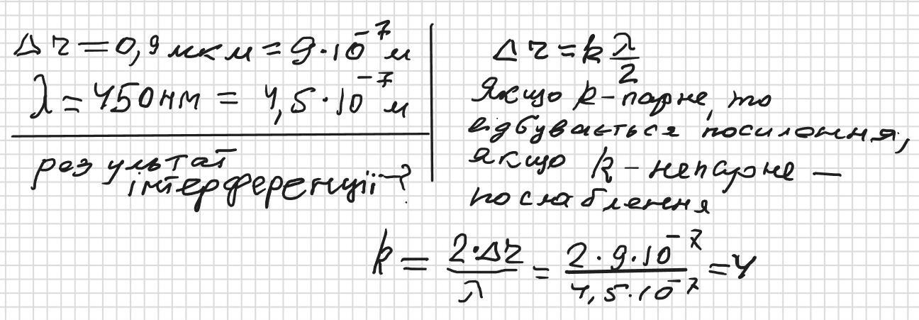 У деяку точку простору приходять когерентні хвилі з різницею ходу 0,9 мем , визначте посилиться чи ослабне світло в цій точці , якщо в неї приходять хвилі довжиною 450 нм