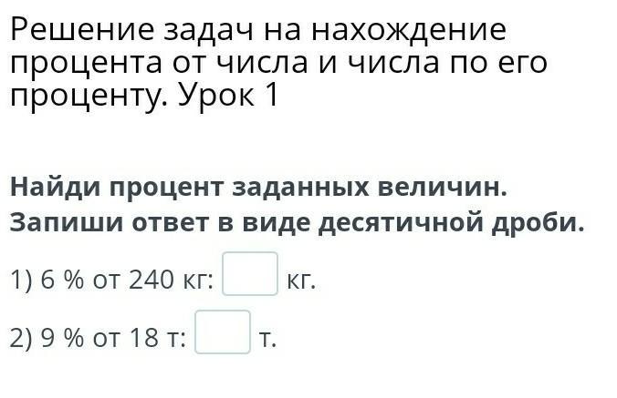 Найди процент заданных величин. Запиши ответ в виде десятичной дроби. 1) 6 % от 240 кг: 2) 9 % от 18 т: