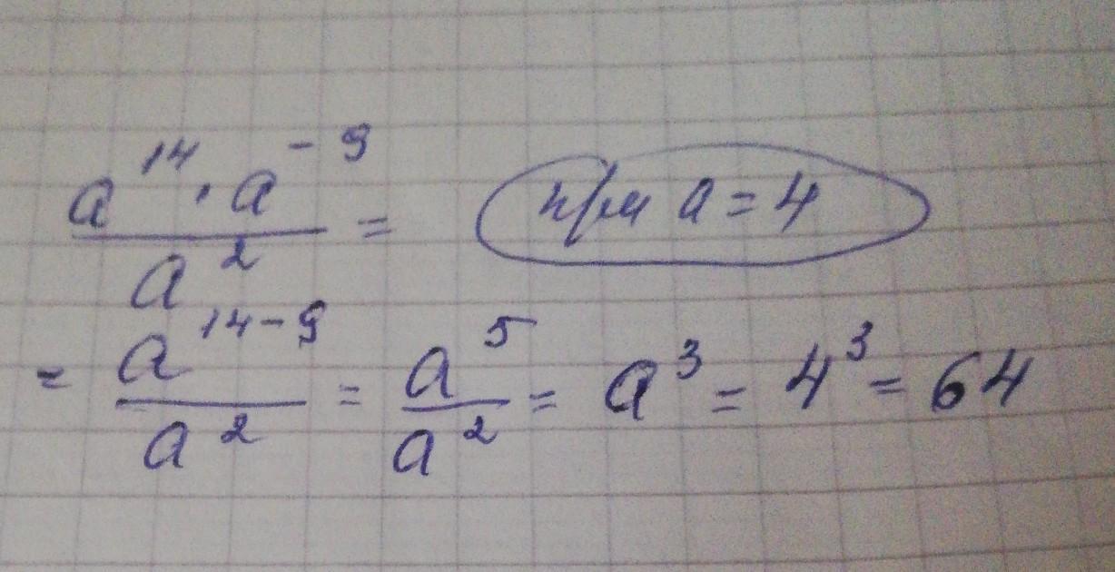 а^14×а^-9/а^2=а^14-9/а^2=а^5/а^2=а^3