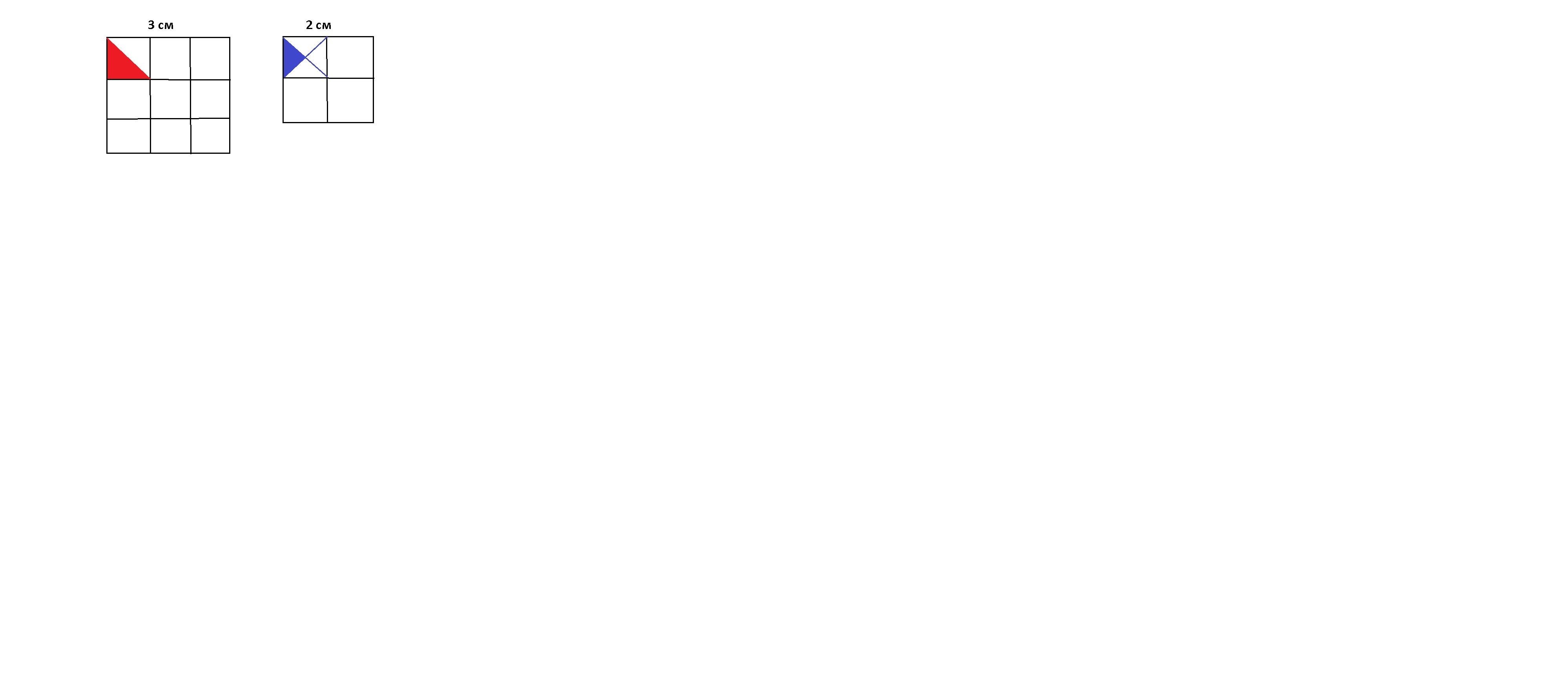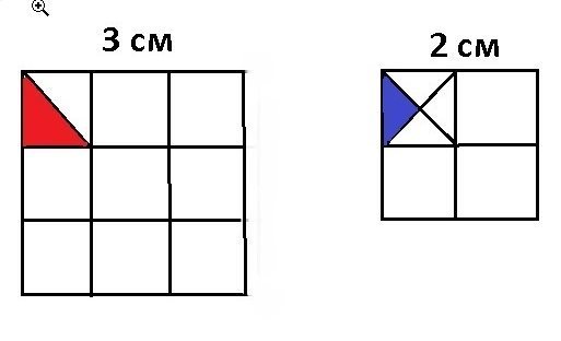 даны два квадрата один состоит из 9 маленьких квадратиков другой из 4, нужно:выразить площадь каждого квадрата в см2. выразить площадь этих квадратов в а) красных треугольниках , запишите произведение. б) синих треугольниках, запишите произведение . (красный треугольник это маленький квадрат разделенный пополам. синий треугольник это маленький квадрат разделенный на четыре части. одна часть это и есть треугольник)