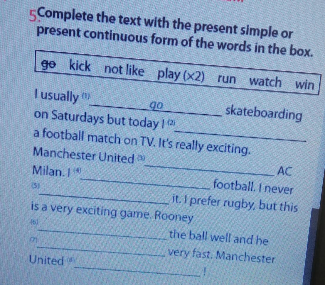 2.watch 3. play 4.not like 5.play 6.kick 7.run 8.win
