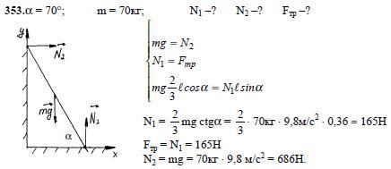 Лестница составляет с землей угол 70° и опирается о вертикальную стену, трение о которую пренебрежимо мало. Найдите силы, действующие на лестницу со стороны земли и стены, если человек массой 70 кг поднялся по лестнице на две трети ее длины. Ответ должен быть: 470 Н, 843 Н