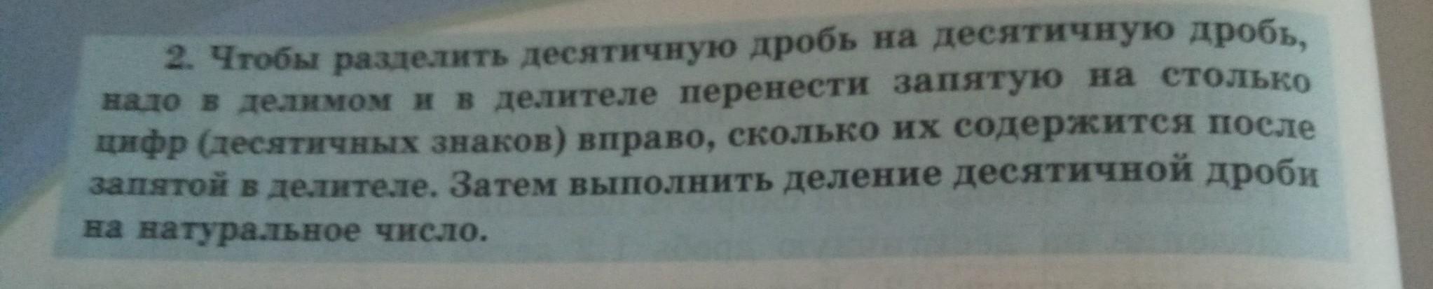 Чтобы разделить десятичную дробь на десятичную, надо: – перенести в делимом и в делителе запятые вправо на столько цифр, сколько их содержится после запятой в делителе; – выполнить деление на натуральное число. Чтобы записать обыкновенную дробь в виде десятичной, нужно числитель этой дроби разделить на знаменатель.