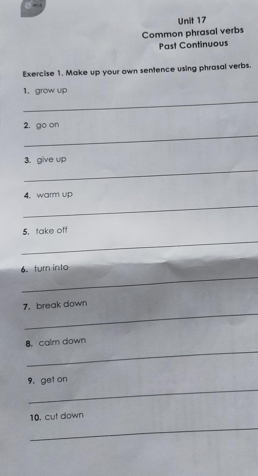 Activity boo Unit 17 Common phrasal verbs Past Continuous Exercise 1. Make up your own sentence using phrasal verbs. 1. grow up 2. go on 3. give up 4. warm up 5. take off 6. turn into 7. break down 8. calm down 9. get on 10. cut down